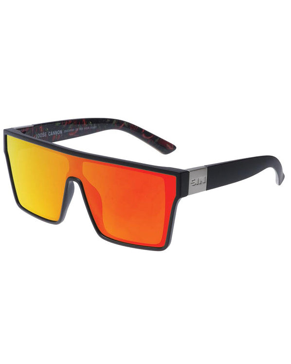 This square-faced frame is most certainly the life of the party. Not only does this style make a statement on the outside, each new colourway features an individual Loose Cannon inspired print. Featuring a flat-top brow with a square shield polarised lens, this bolder than most style is a real party starter.